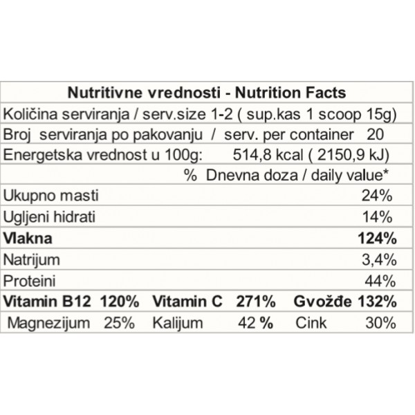 Super obrok ima u sebi visok procenat prirodnih vlakana koja regulisu i ubrzavaju metabolizam, osiguravaju prohodnost digestivnog trakta i brzu eliminaciju toksina iz organizma. Nutritivni kvasac bogat je prirodnim proteinima, kompleksom vitamina B, kao i vitaminom B12. Odličan je suplement za profesionalne sportiste i rekreativce.